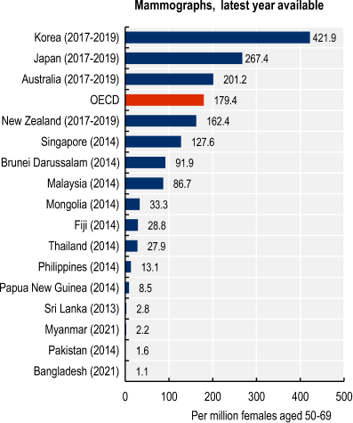 Korea leads globally in the availability of mammographs and maintains above-OECD-average access to CT scanners